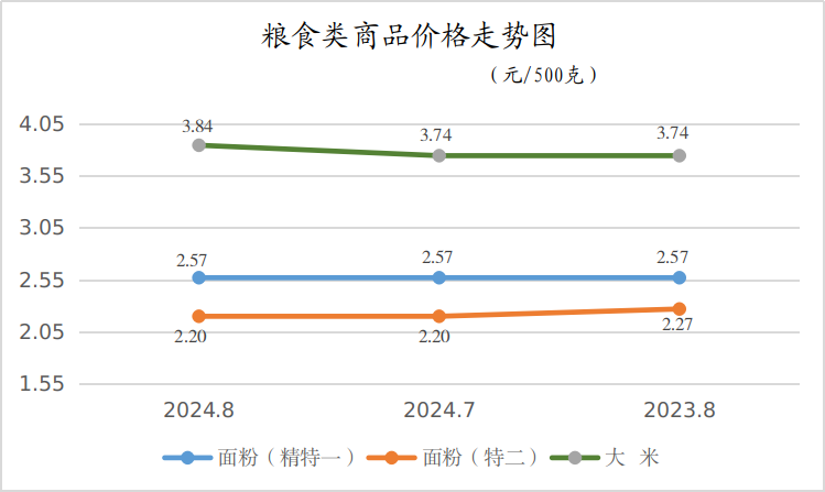 8月份,市场精特一面粉平均零售价格为2.57元/500克,月环比、同比均基本持平;特二面粉平均零售价格为2.20元/500克,月环比基本持平,同比下降了3.08%。