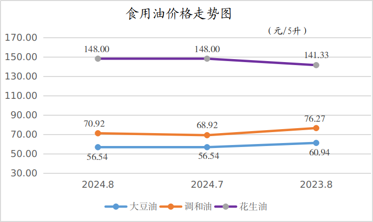 8月份,金龙鱼大豆油(桶装)平均零售价格为56.54元/5升,月环比持平,同比下降了7.22%;金龙鱼食用调和油(桶装)平均零售价格为70.92元/5升,月环比上涨了2.90%,同比下降了7.01%;金龙鱼花生油(桶装)平均零售价格为148.00元/5升,月环比持平,同比上涨了4.72%。