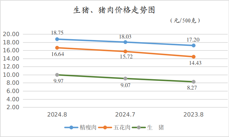 8月份,精瘦肉、五花肉平均零售价格分别为18.75元/500克、16.64元/500克,月环比分别上涨了3.99%、5.85%,同比分别上涨了9.01%、15.32%。