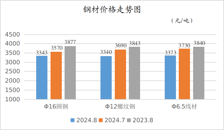 8月份,主要品种钢材平均销售价格:Φ16圆钢3343元/吨、Φ12螺纹钢3340元/吨、Φ6.5线材3373元/吨,月环比分别下降了6.36%、9.49%、9.57%,同比分别下降了13.77%、13.09%、12.16%。