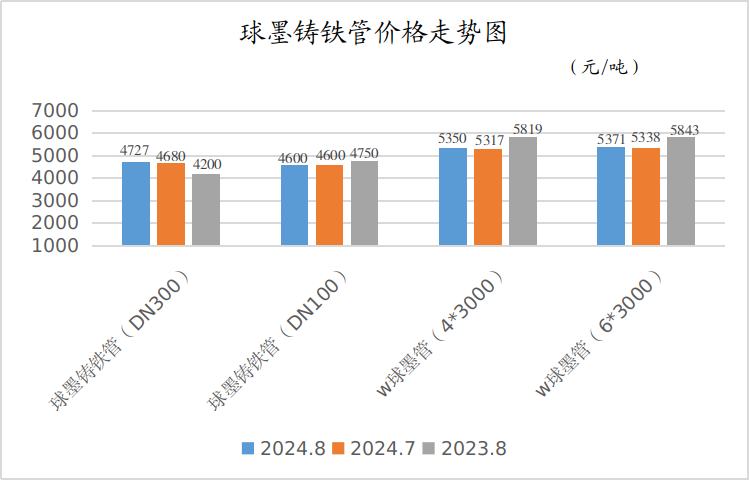 8月份,球墨铸铁管(DN300)平均出厂价格为4727元/吨,月环比、同比分别上涨了1.00%、12.55%;球墨铸铁管(DN100)平均出厂价格为4600元/吨,月环比持平,同比下降了3.16%;w球墨管(4*3000)、w球墨管(6*3000)平均出厂价格分别为5350元/吨、5371元/吨,月环比均基本持平,同比分别下降了8.06%、8.08%。