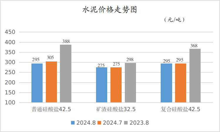 8月份,主要品种水泥平均销售价格:普通硅酸盐水泥(42.5强度)295元/吨,月环比、同比分别下降了3.28%、23.97%;矿渣硅酸盐水泥(32.5强度)275元/吨、复合硅酸盐水泥(42.5强度)295元/吨,月环比均持平,同比分别下降了7.72%、19.84%。