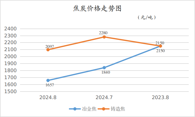 8月份,冶金焦(20-80)、铸造焦(80以上)平均出厂价格分别为1657元/吨、2097元/吨,月环比分别下降了9.95%、8.03%,同比分别下降了22.93%、2.47%。