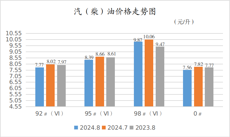 8月份,92#(Ⅵ)、爱跑95#(Ⅵ)汽油平均销售价格分别为7.77元/升、8.39元/升,月环比均下降了3.12%,同比分别下降了2.51%、2.56%;爱跑98#(Ⅵ)汽油平均销售价格为9.87元/升,月环比下降了1.89%,同比上涨了4.22%。